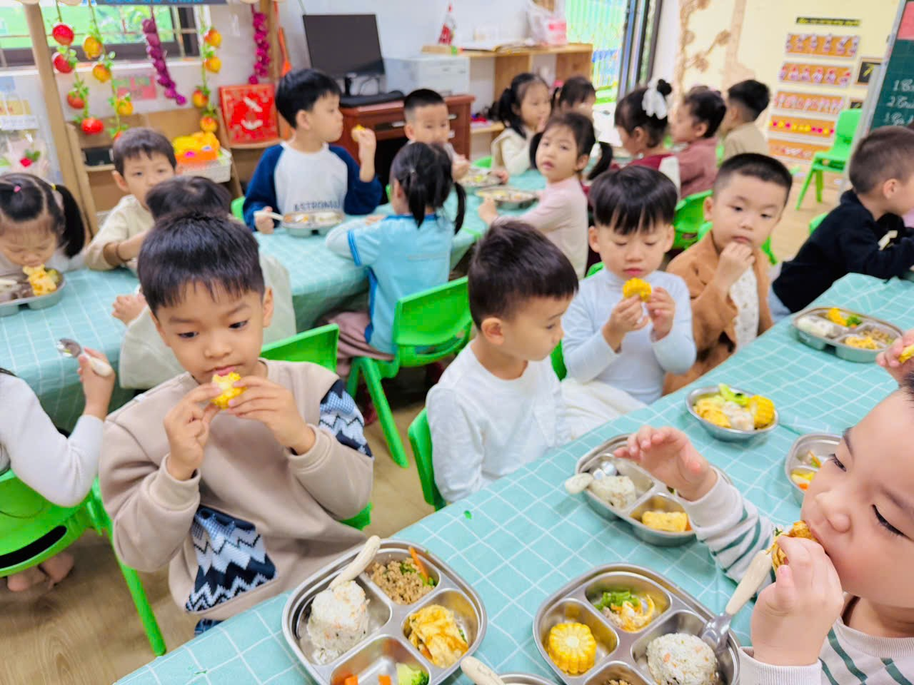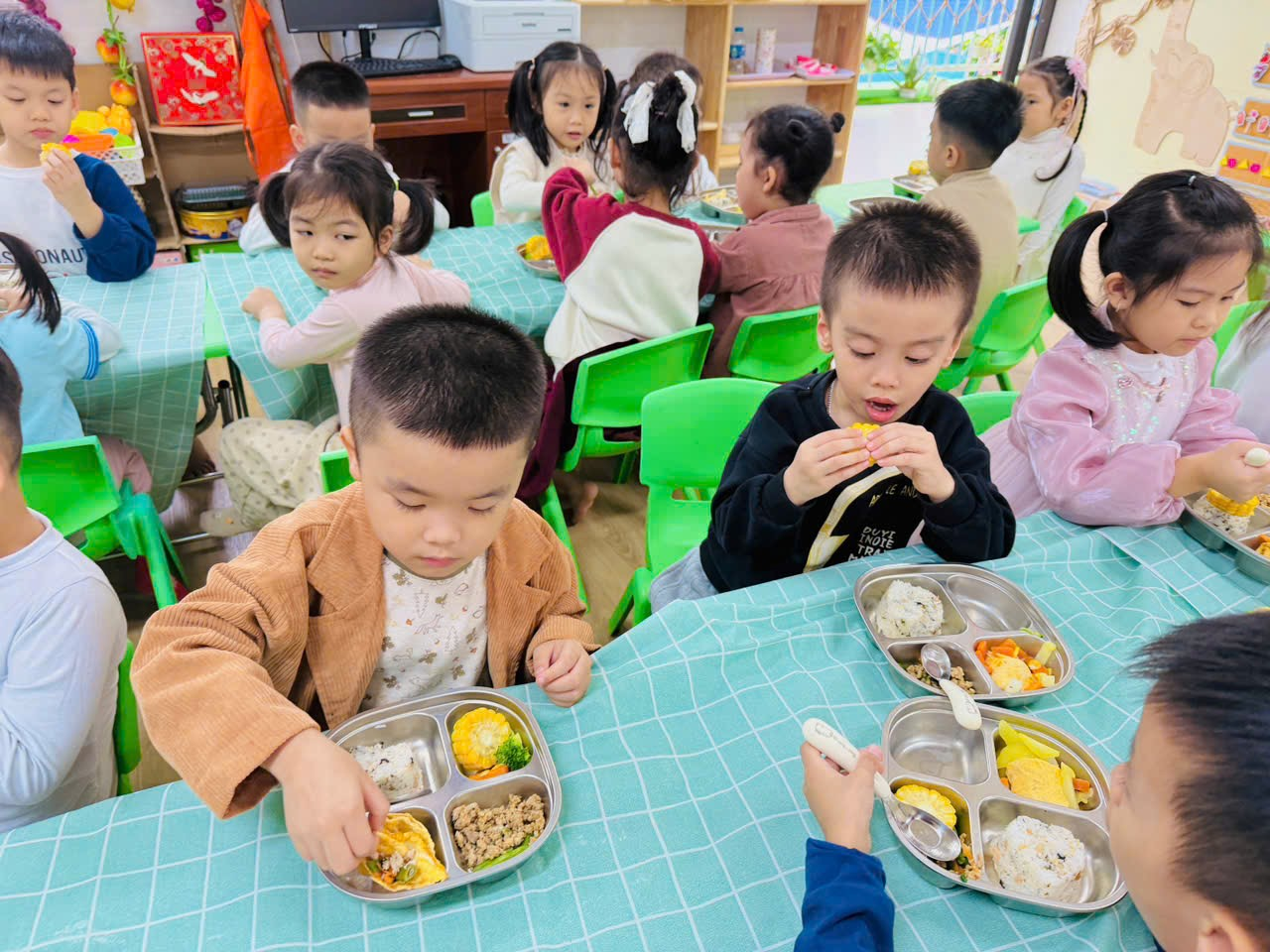 Các bé vừa được thưởng thức món ngon, vừa cảm nhận tình yêu thương ấm áp từ gia đình và nhà trường.