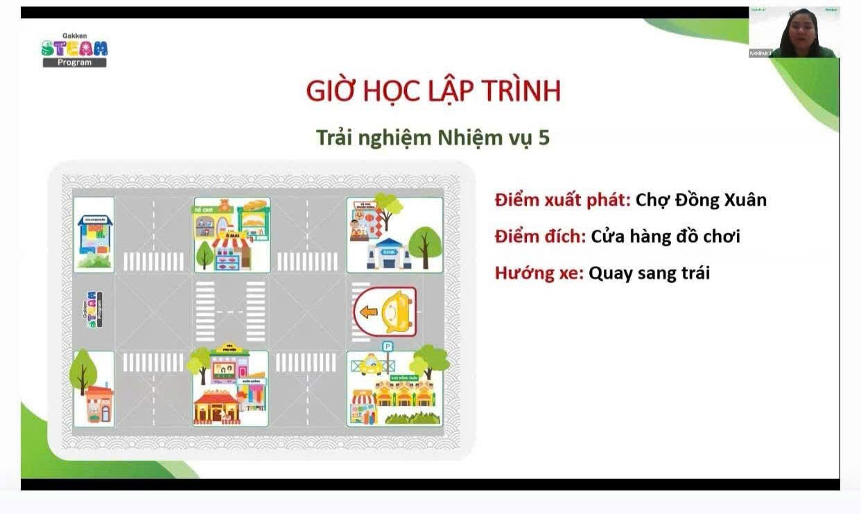 Một giờ học STEAM lập trình đã mang đến cho trẻ những trải nghiệm thú vị khi tìm hiểu về chuỗi lập trình thông qua bài vận động minh họa với các lệnh tiến, lùi, trái, phải.