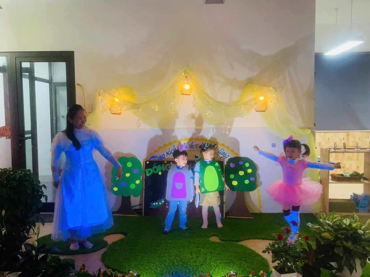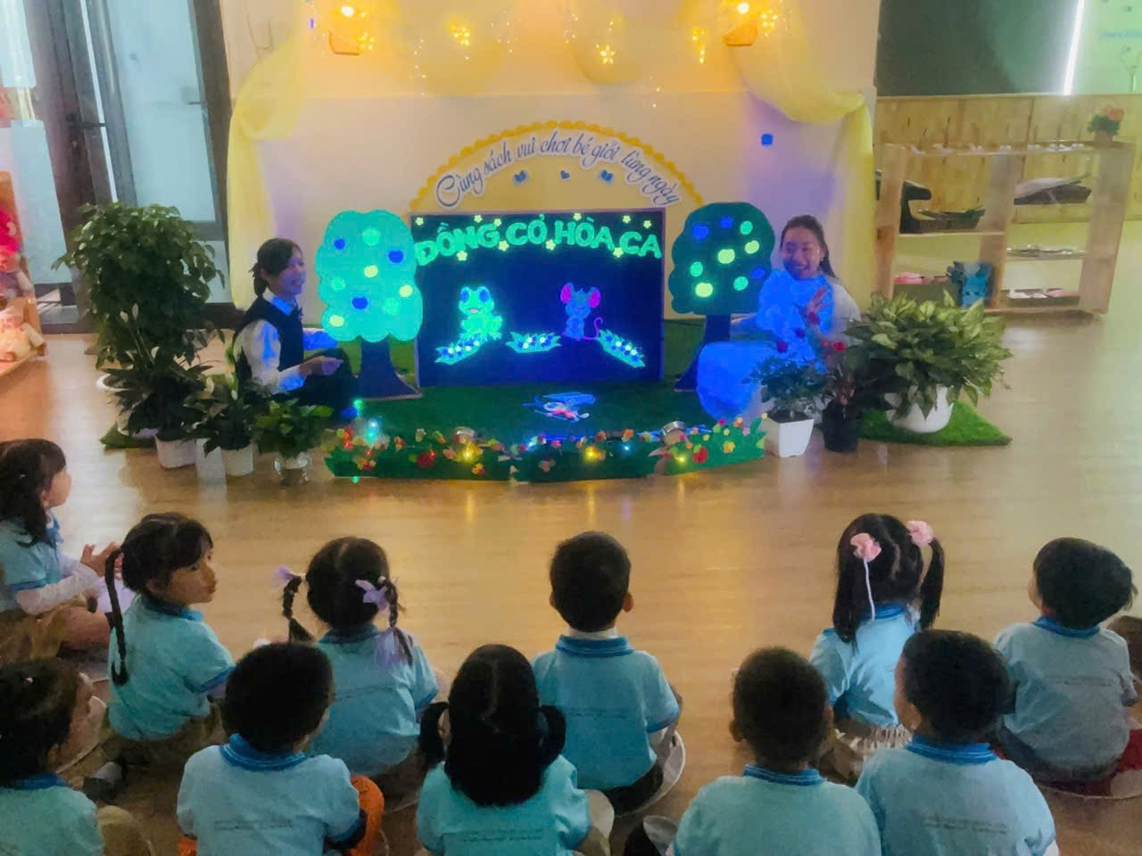 Hoạt động Kể chuyện âm nhạc: Các cô giáo đã ứng dụng công nghệ AI cho video truyện, những nhân vật rối được thiết kế sáng tạo bằng rối phát sáng mang đến cho trẻ câu chuyện thú vị đầy màu sắc, chân thực kết hợp với âm nhạc sống động đưa trẻ đến gần hơn với thiên nhiên, hòa mình vào câu chuyện.