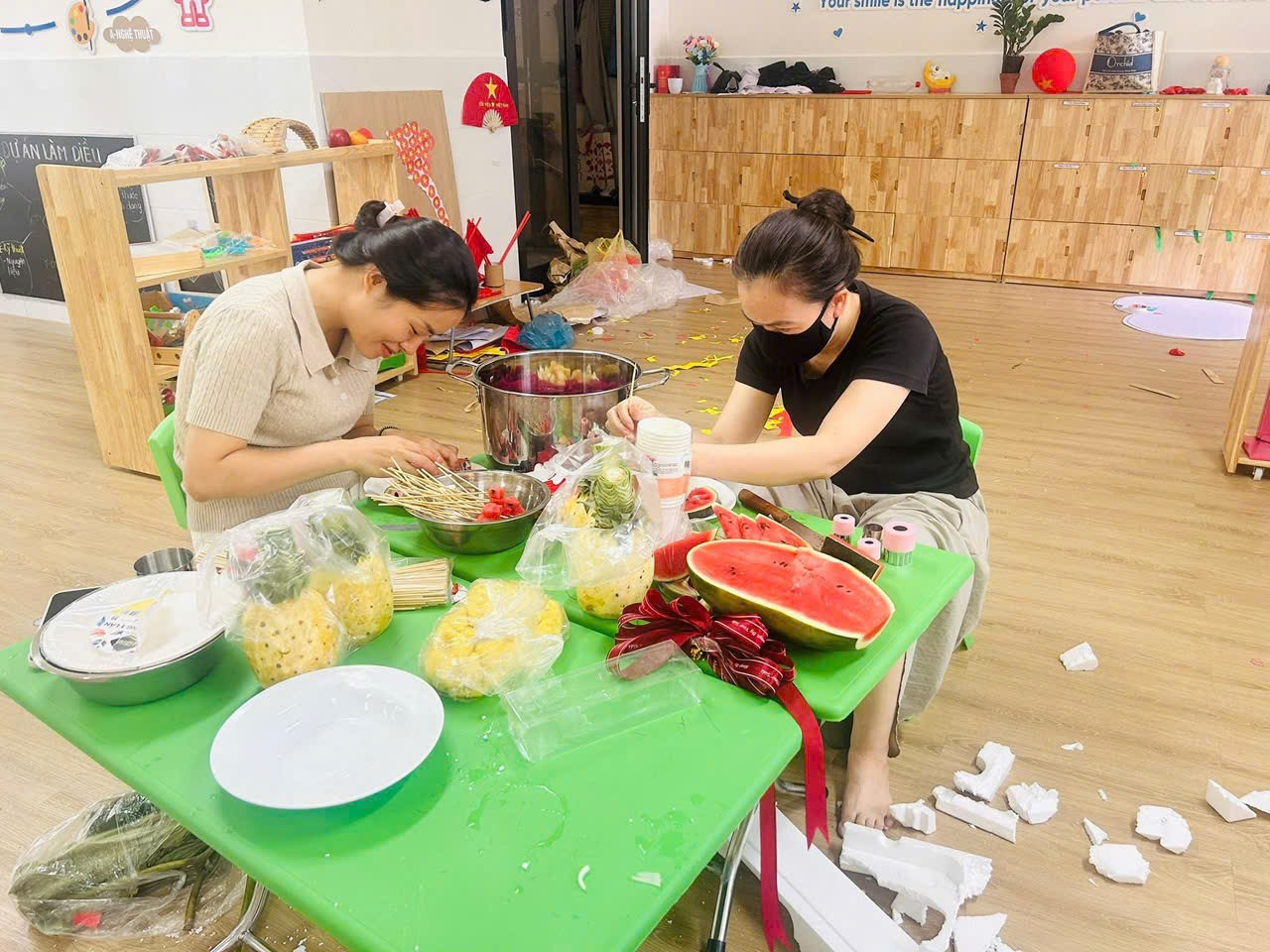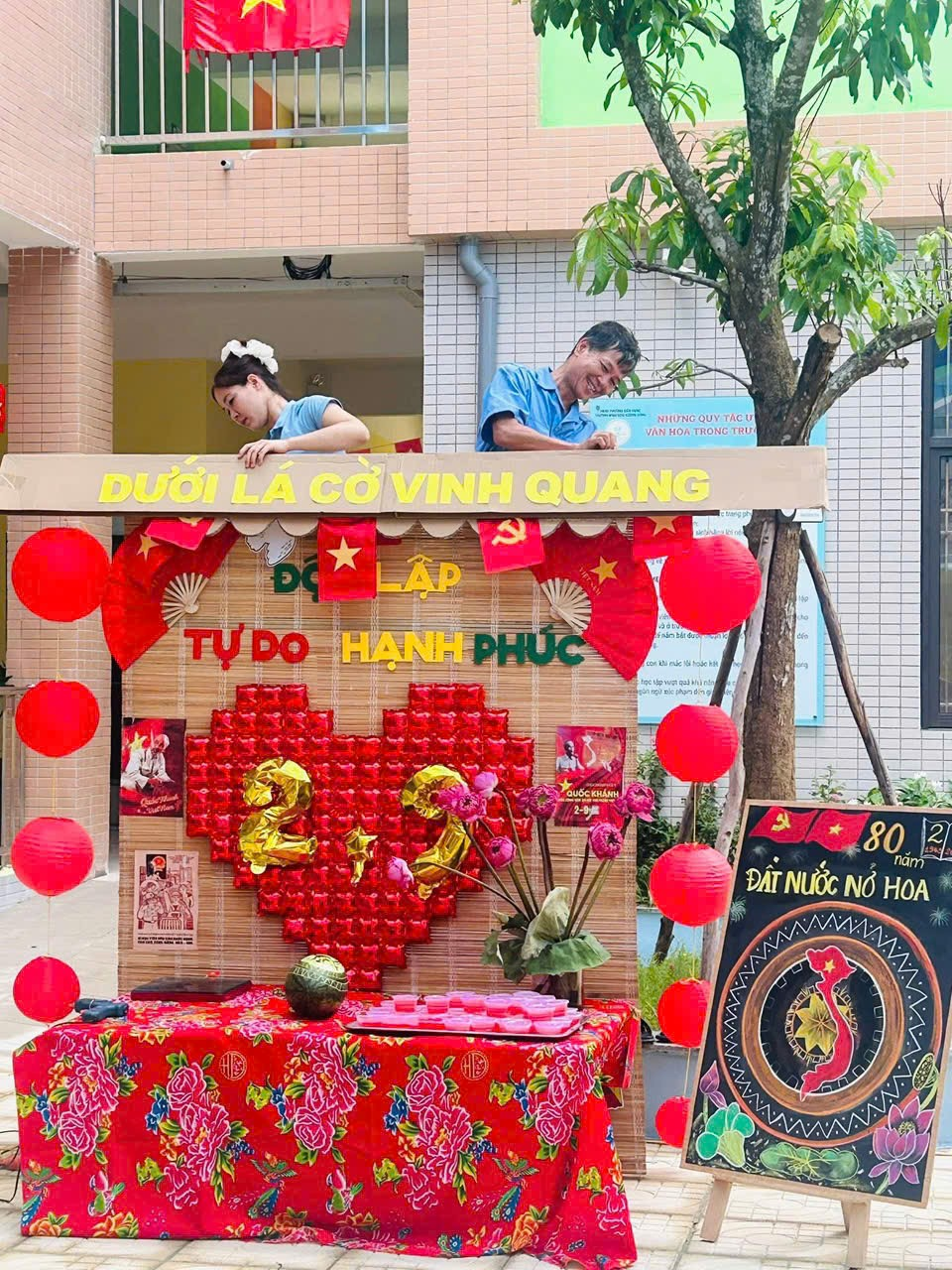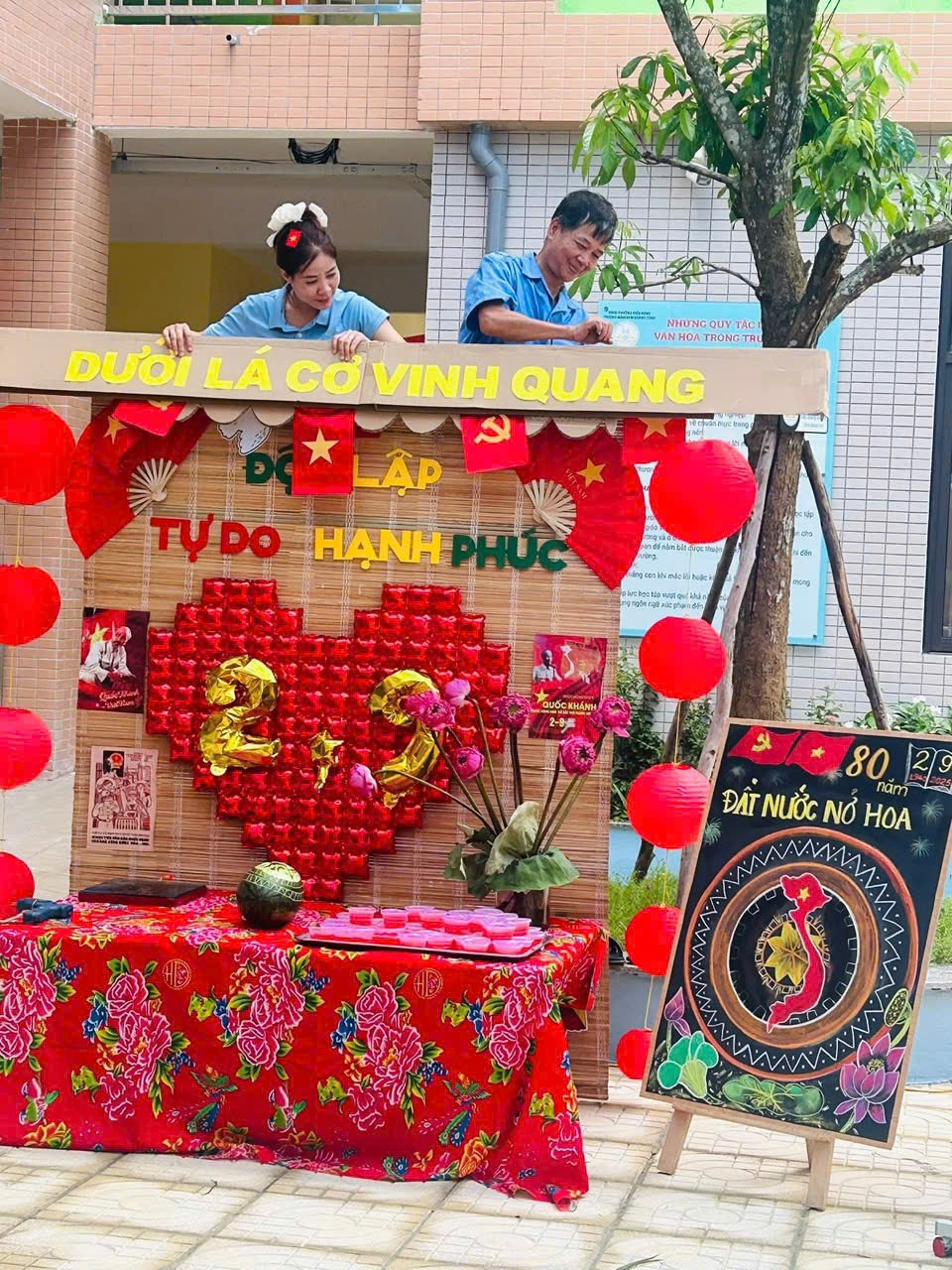 Không khí những ngày này tại Trường Mầm non Hoàng Công thật rộn ràng và đầy sắc màu! Các cô giáo, phụ huynh và nhân viên nhà trường đang tất bật chuẩn bị cho Workshop Ẩm thực Việt – một hoạt động đặc biệt chào mừng 80 năm Quốc khánh 2/9 Nước Cộng Hoà Xã Hội Chủ Nghĩa Việt Nam. Nhằm lan tỏa tình yêu quê hương đất nước đến với các bạn nhỏ trường MN Hoàng Công. Những gian hàng được dựng nên với phong cách gần gũi, tái hiện hình ảnh làng quê Việt Nam xưa và nay, rực rỡ cờ đỏ sao vàng, trang trí bằng lá cọ, tre nứa, cùng nhiều hình ảnh ý nghĩa gắn liền với lịch sử dân tộc.