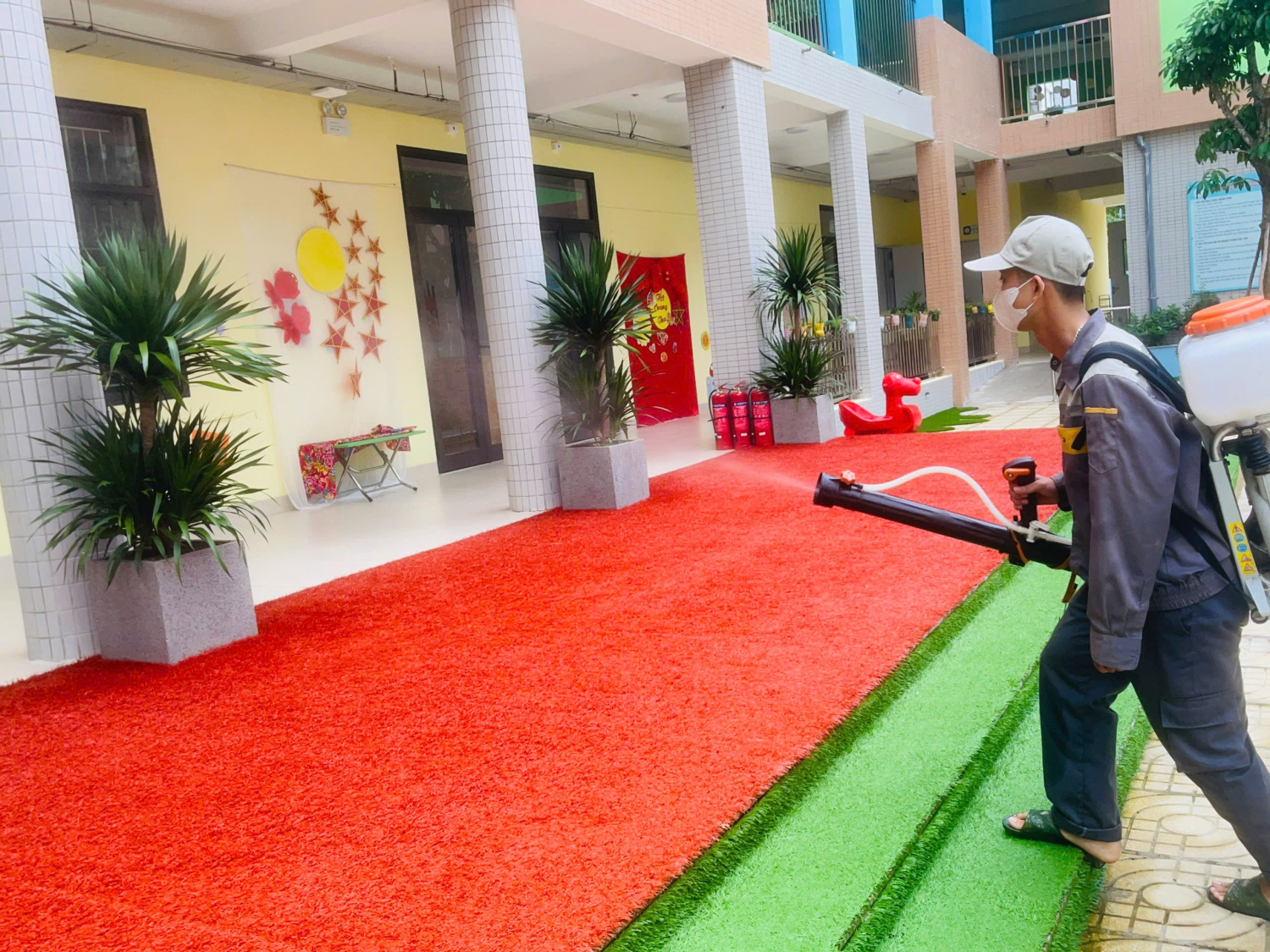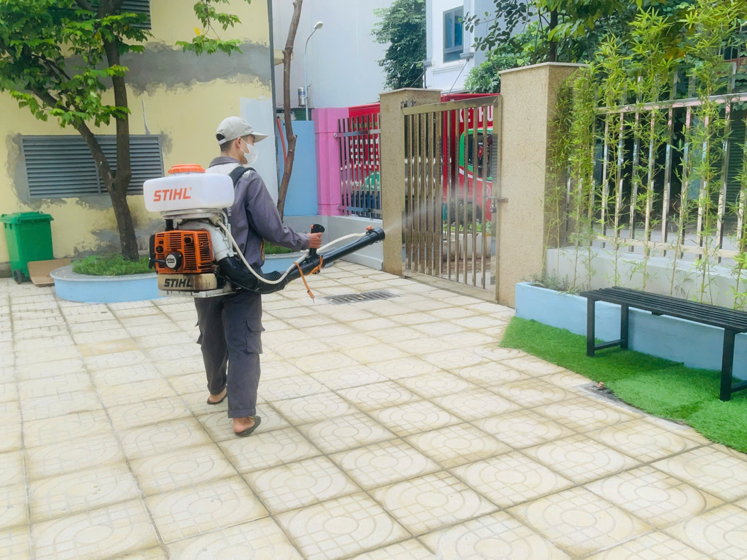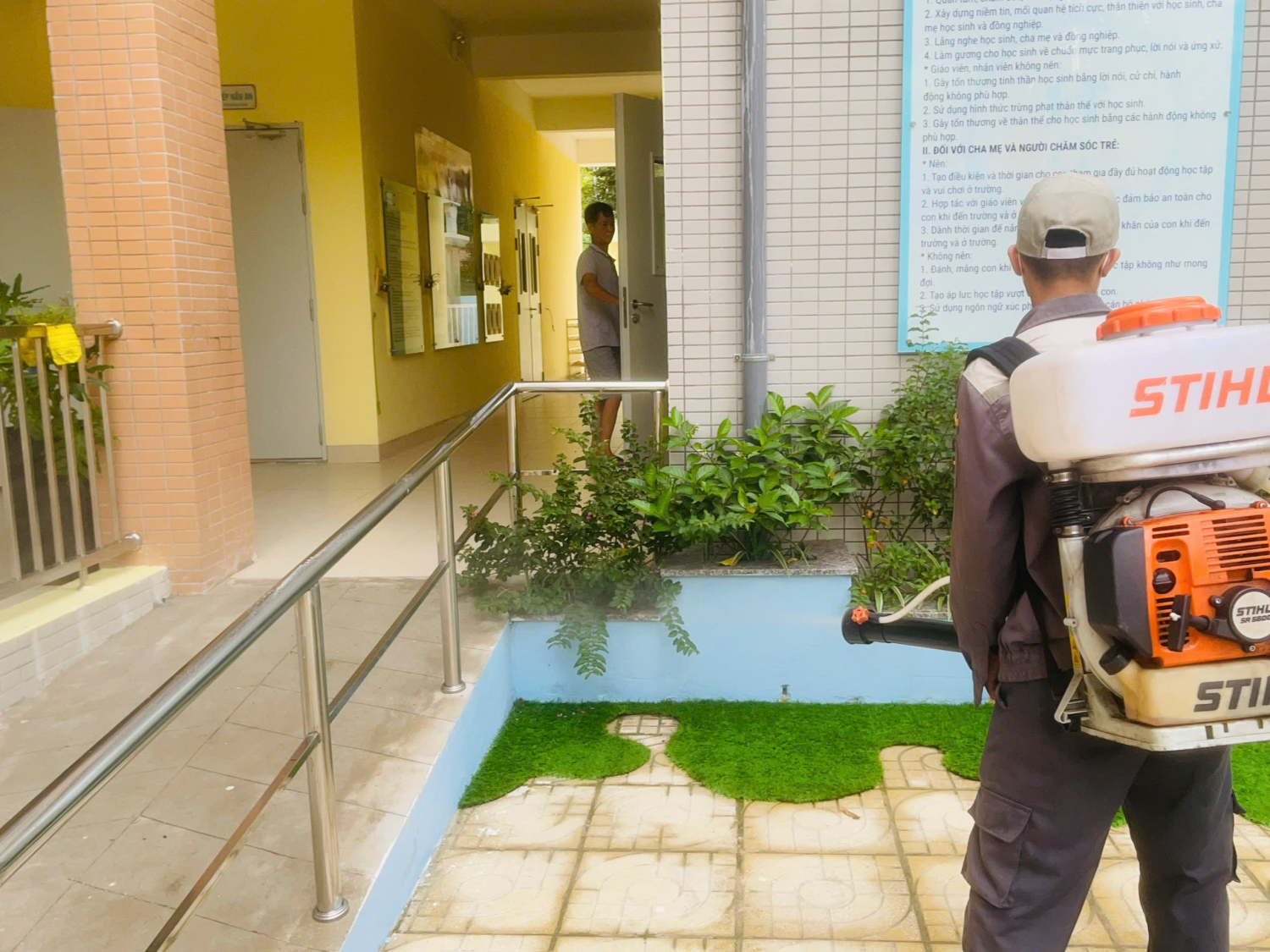 Để đảm bảo môi trường học tập xanh – sạch – an toàn cho các con, Nhà trường đã tiến hành phun khử khuẩn, vệ sinh toàn bộ khuôn viên ngoài lớp học.