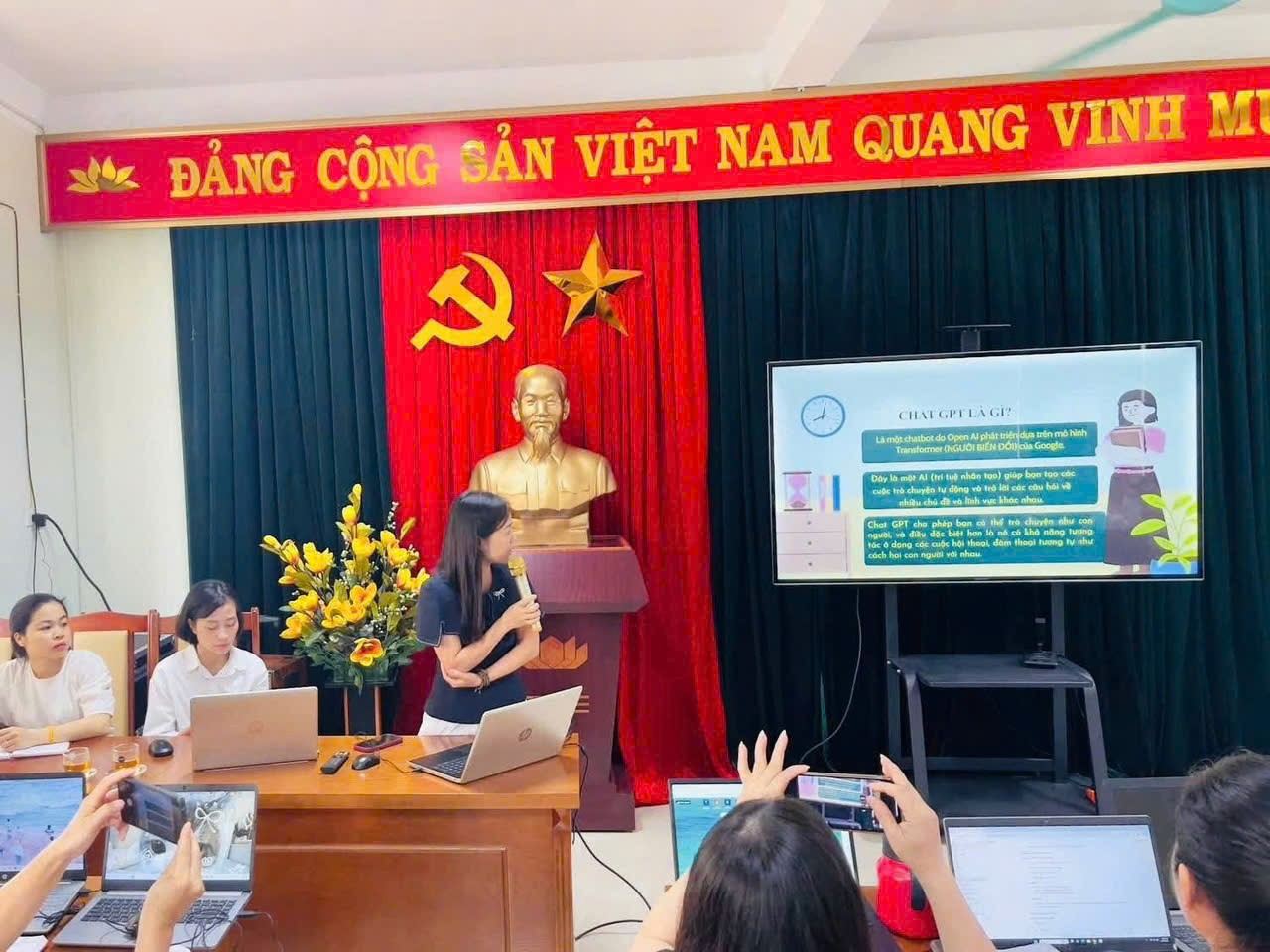 - Cô Phạm Thị Thanh Vân- Hiệu trưởng nhà trường hướng dẫn giáo viên sử dụng các phần mềm AI như: Chat GPT, IIELevenLabs, KlingAI, Suno.... và thiết kế video chuyện sinh động phục vụ hoạt động dạy học.