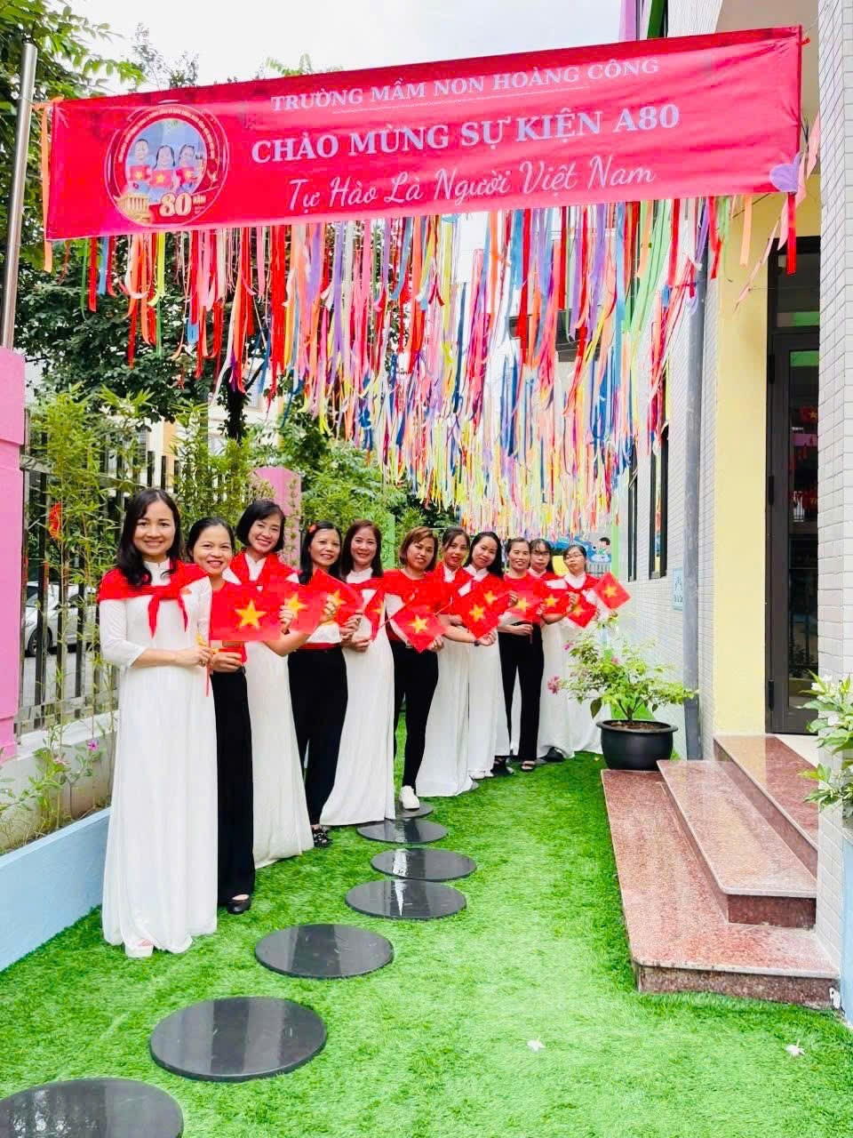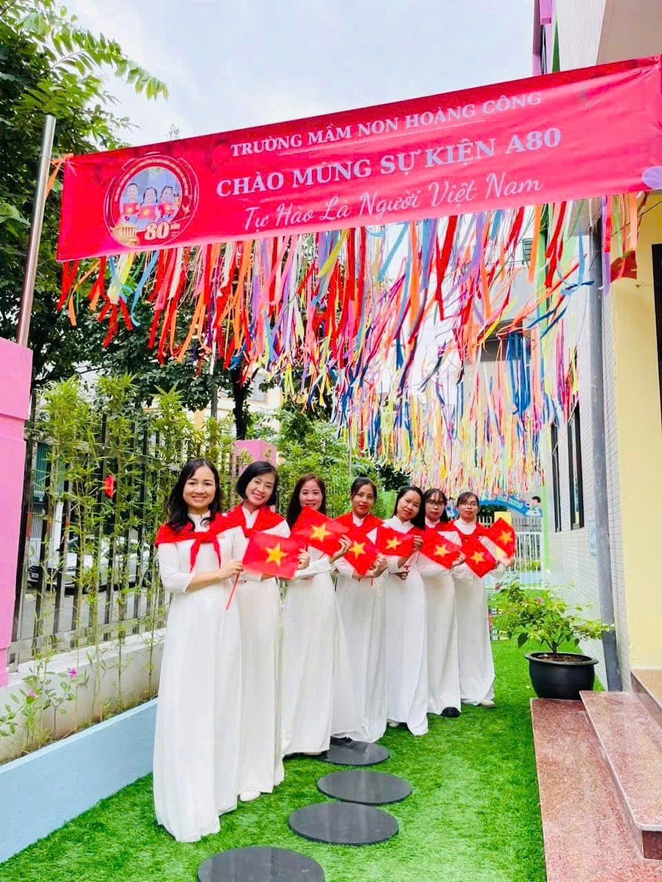 Trong không khí rộn ràng của sự kiện A80, tập thể cán bộ – giáo viên Trường Mầm non Hoàng Công đã cùng nhau khoác lên mình tà áo dài trắng, sắc đỏ sao vàng để lan tỏa tình yêu quê hương, đất nước.Những nụ cười rạng rỡ, những bước chân tự tin trên con đường rợp cờ hoa và sắc màu rực rỡ chính là minh chứng cho tinh thần đoàn kết, lòng tự hào dân tộc.