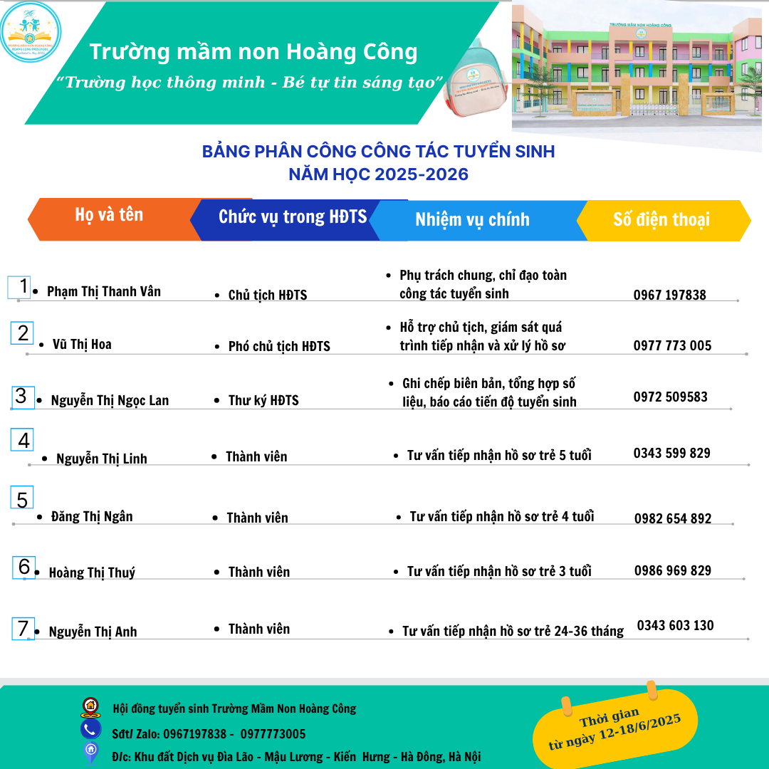 Trường Mầm non Hoàng Công xin trân trọng thông báo về bảng phân công công tác tuyển sinh năm học 2025-2026. Nhà trường rất vui khi được đón tiếp và hỗ trợ các bậc phụ huynh trong thời gian tuyển sinh.